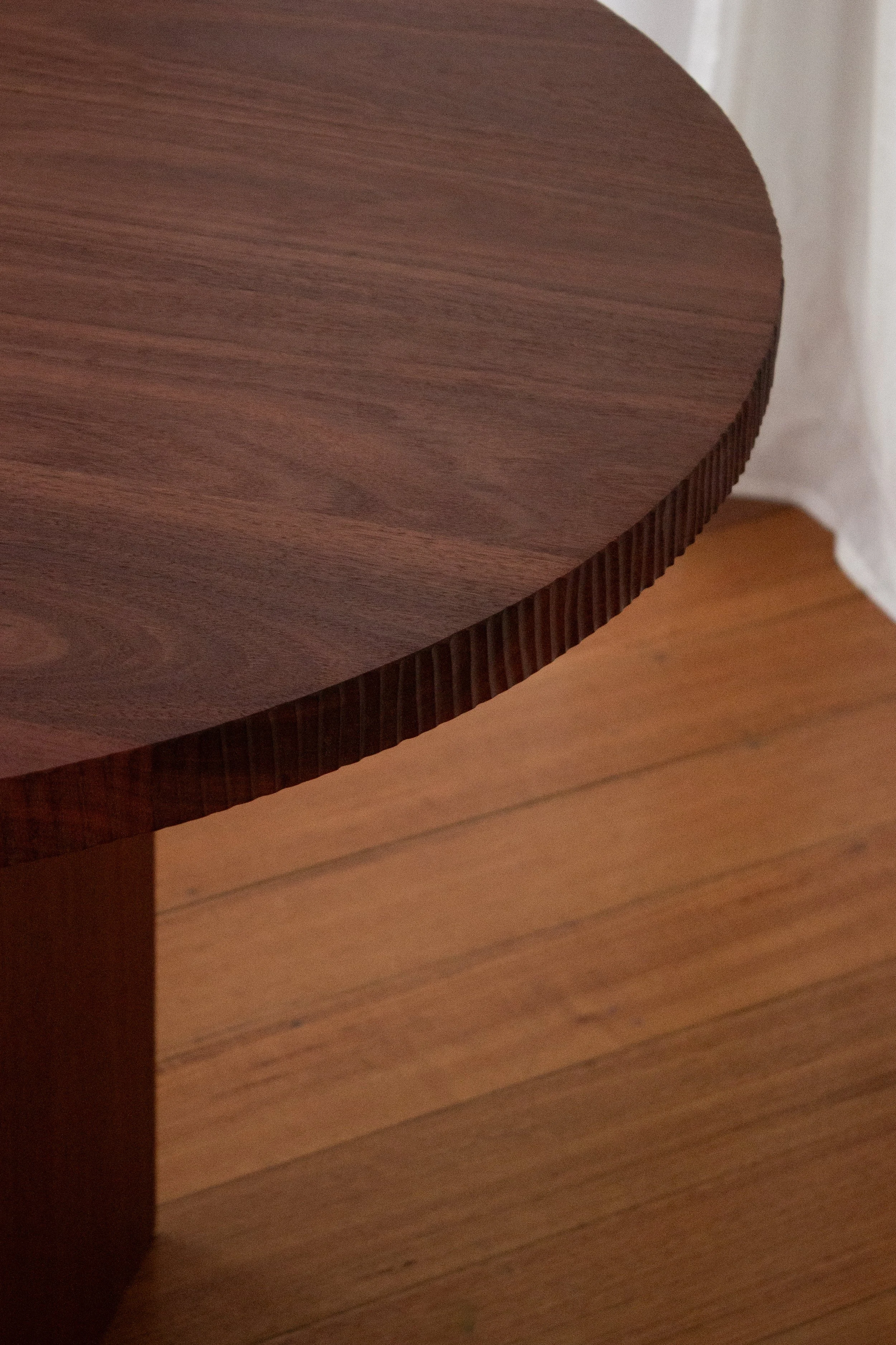 Dimensions: 1050 Diameter x 740H (mm) Materials: jarrah, hardwax oil, steel plate Weight: 70 (kg)