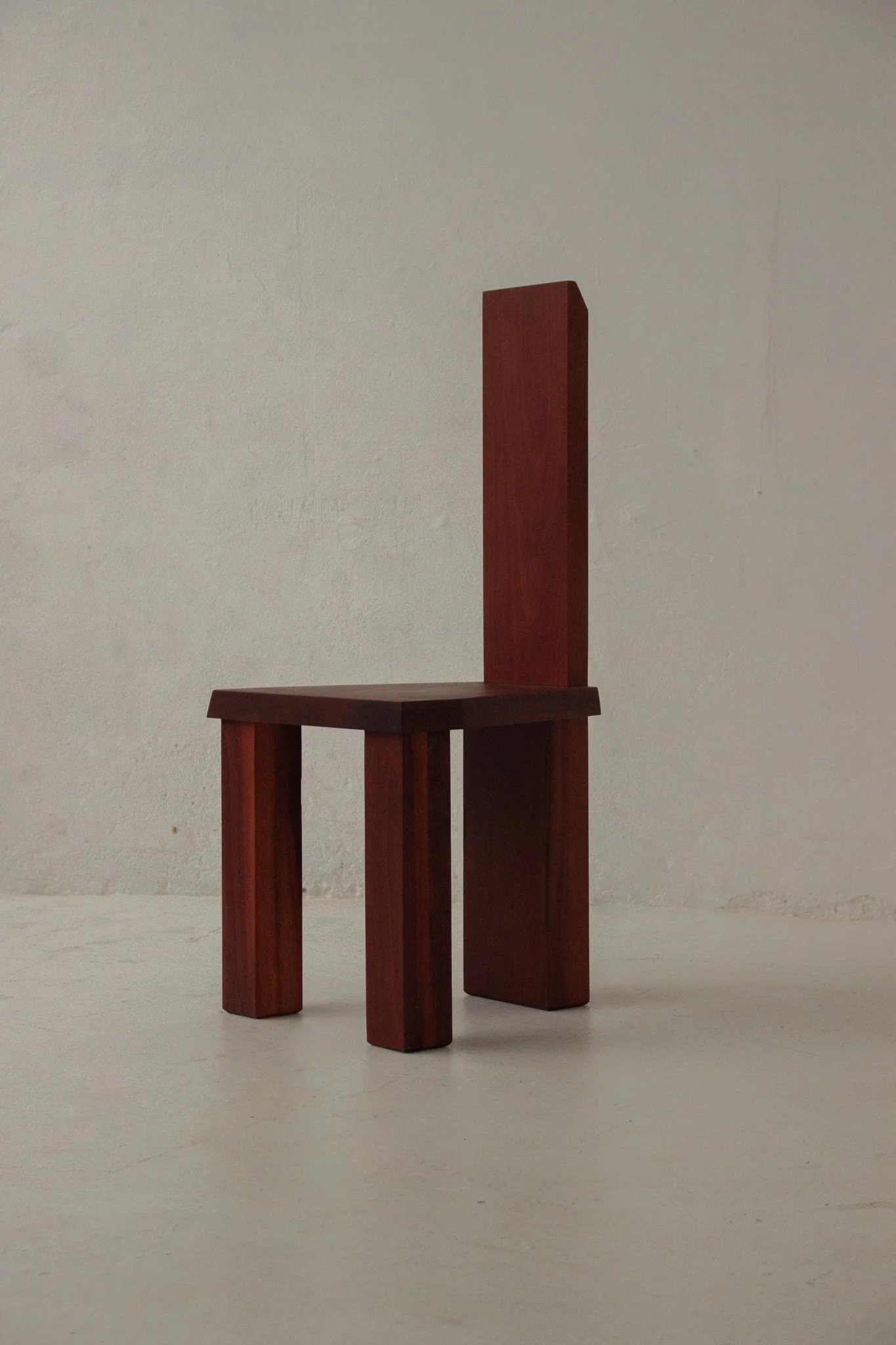 This piece follows the archetype of the classic side chair. It possesses a long hind leg that protrudes up through the seat transitioning into the backrest. The simple form is held also by two bold front legs set into a triangular seat.