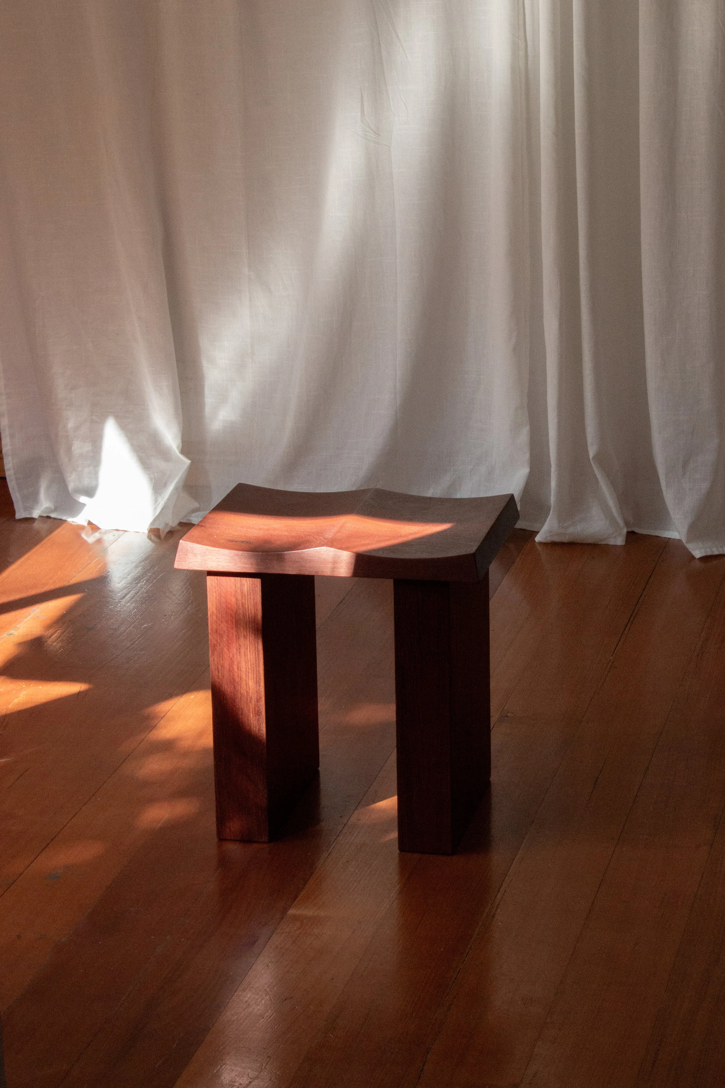 Bold parallel legs hold up a shaped seat inspired by waves and pagoda silhouettes.